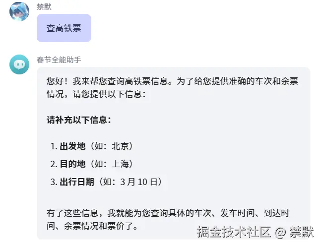 1. 模型自动识别用户意图,提取**出发地、目的地、出行日期、座位类型**等关键信息。