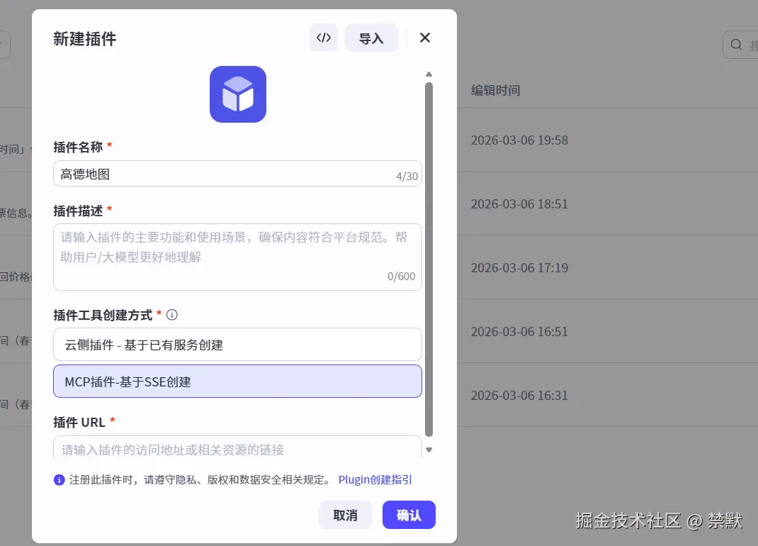 插件我们选择MCP插件-基于SSE创建,可以到魔塔社区寻找自己想要的MCP工具,获取url。