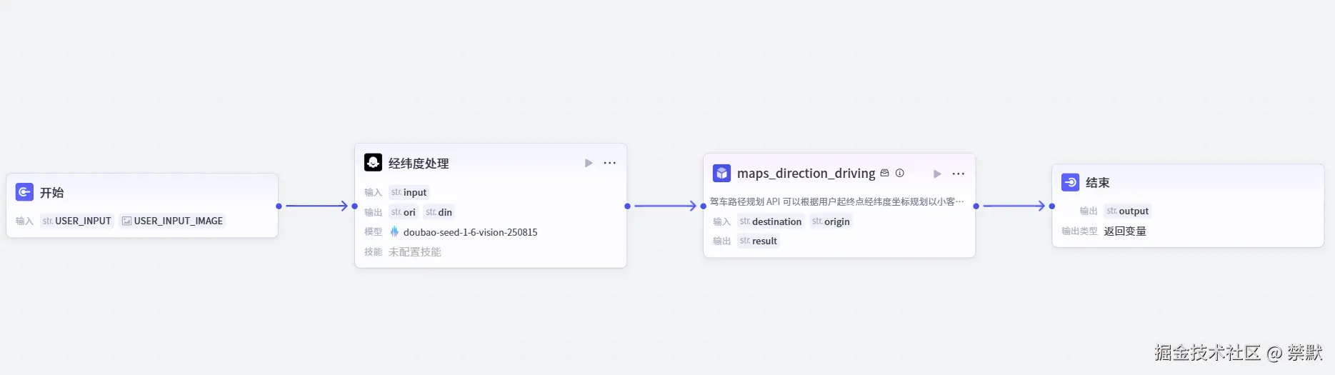 - 经纬度处理节点:提取出发地、目的地、出行时间,同时将出发地和目的地转化为经纬度;