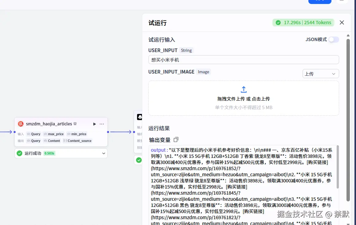 2. 工作流根据商品名称,返回**价格最低的1条好价信息**,含商品名、价格、购买链接。