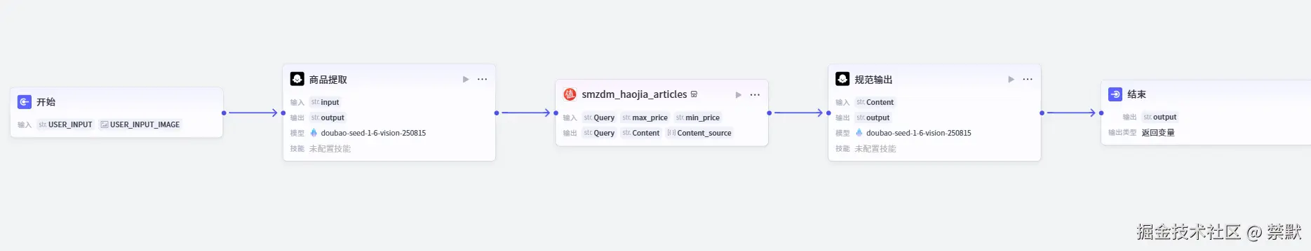 - 插件调用节点:入参为商品名称,出参为好物推荐列表(含价格、链接、描述);