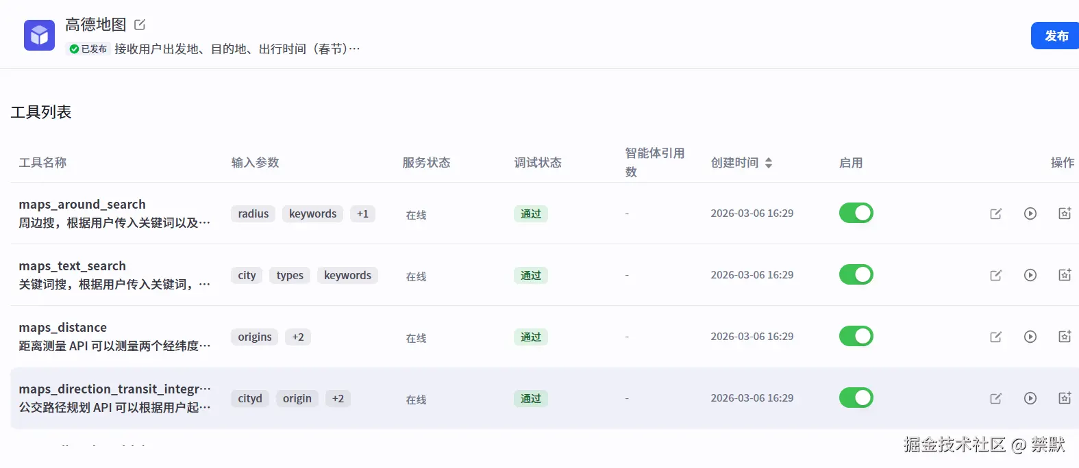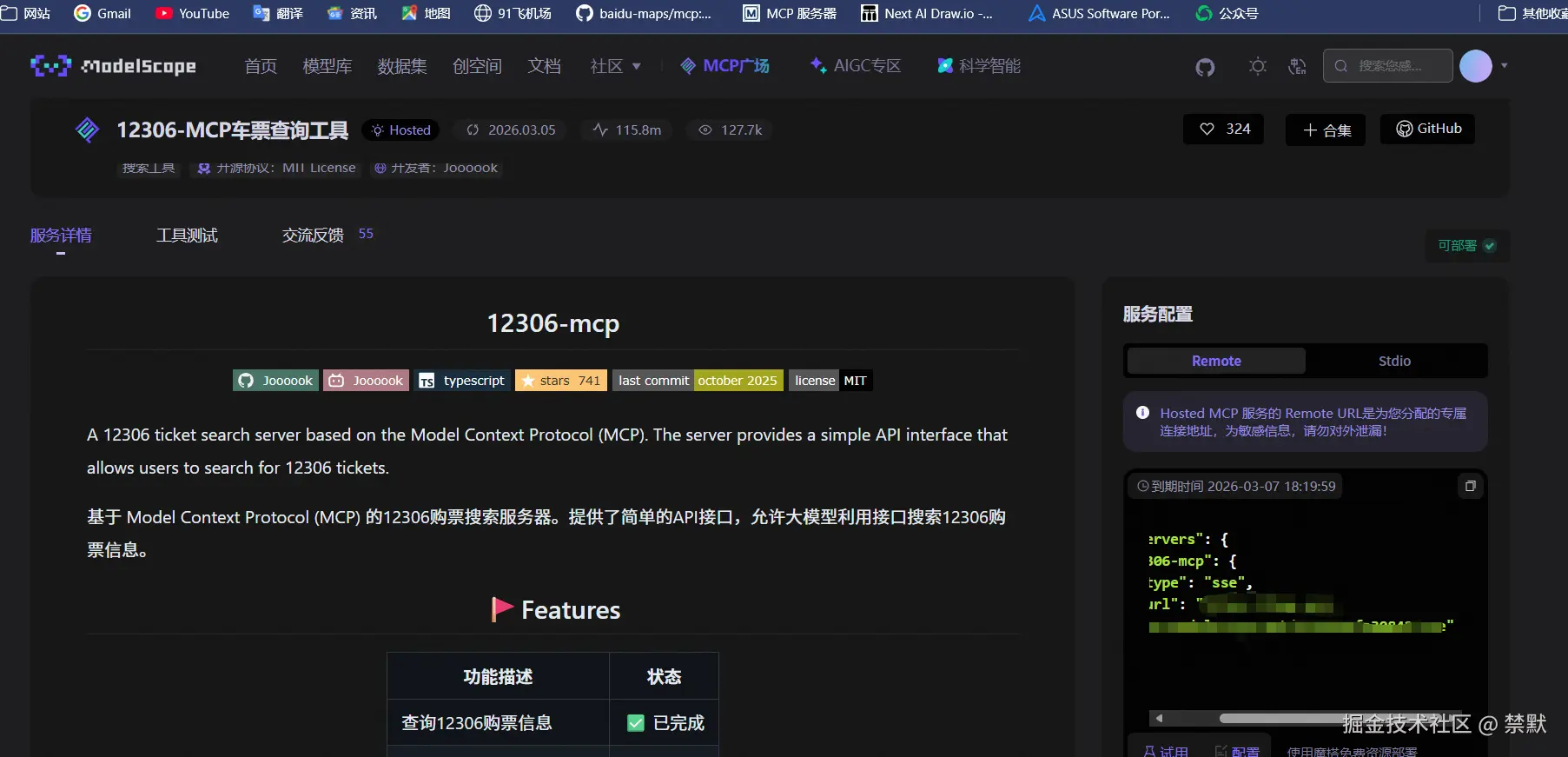 通过魔搭社区的MCP广场创建用于铁路12306访问车票以及高德地图接口的插件。