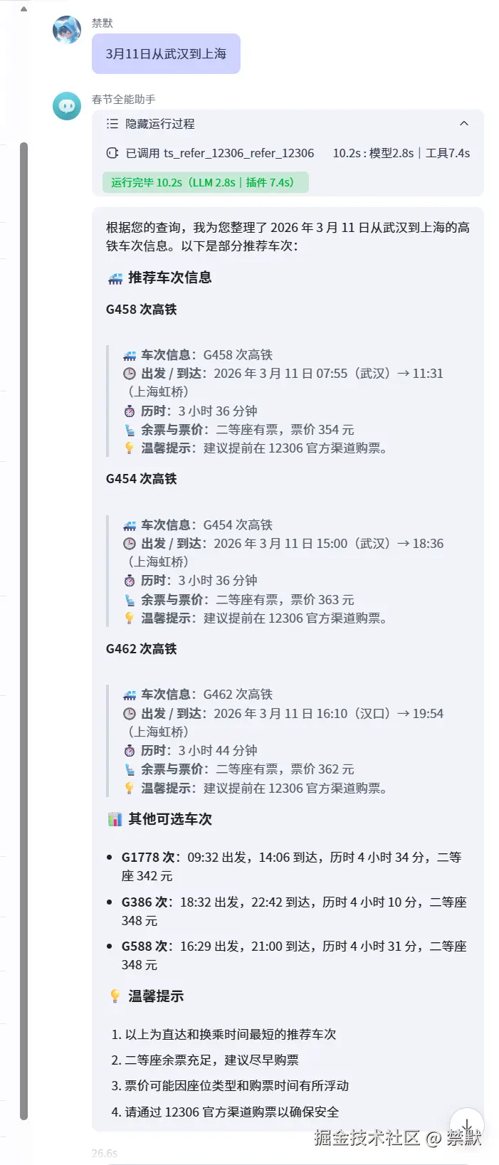 - 触发关键词:高铁票、抢票、车票、回家、返程、余票、车次、几点到、几点出发等。