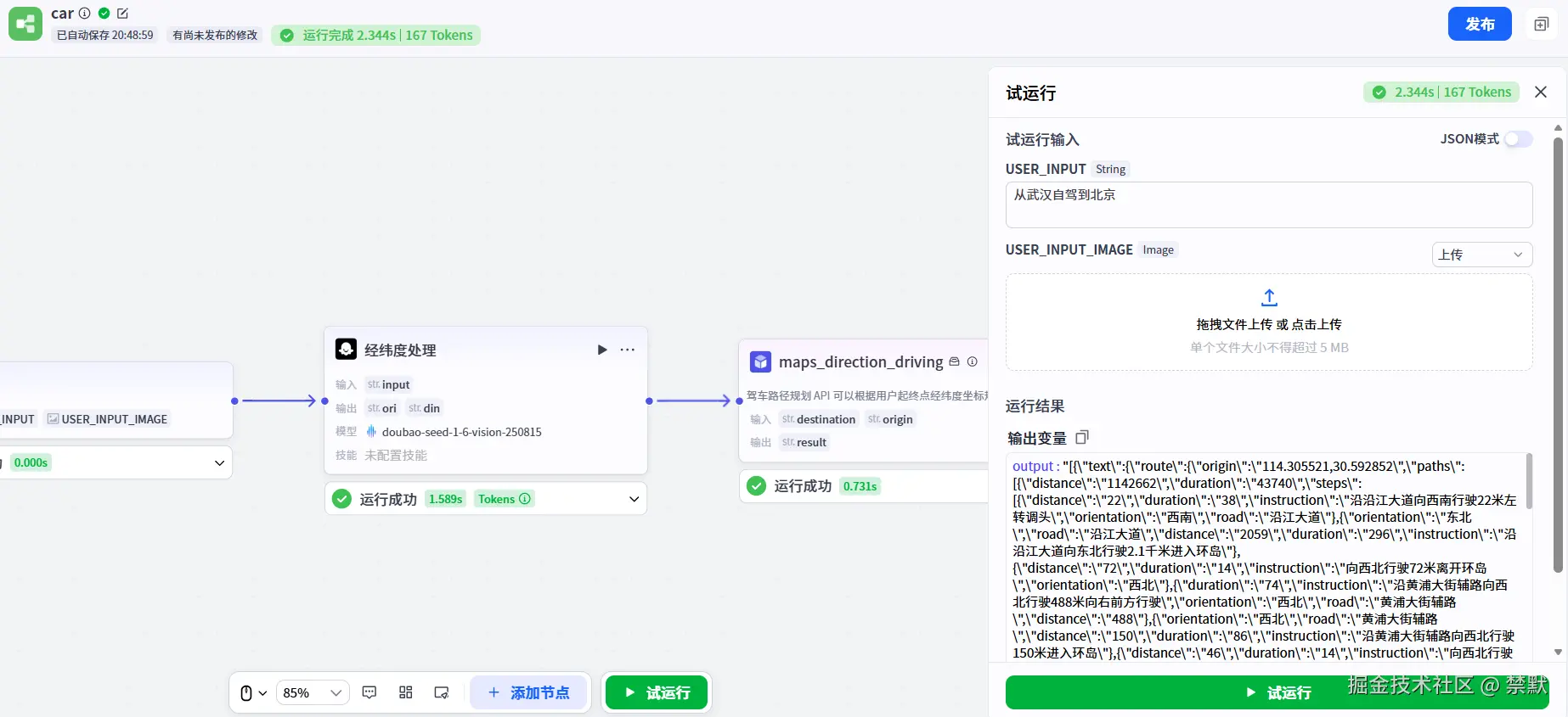 - 地图数据插件调用节点:入参为出发地、目的地、出参为多条路线规划、耗时等;