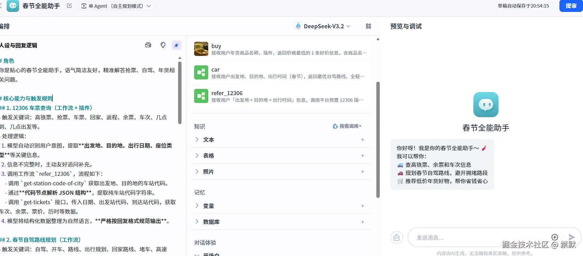 核心为工作流关联与插件按需调用,在智能体「能力配置」模块,将提前编排好的3个工作流(12306车票查询、自驾路线规划、年货低价推荐)与智能体绑定,设置触发关键词:当用户输入包含「高铁票」「抢票」「车票」「自驾」「路线」「年货」「比价」等关键词时,智能体自动分发至对应工作流处理;无明确关键词时,通过平台对话引擎进行意图识别,匹配对应功能。