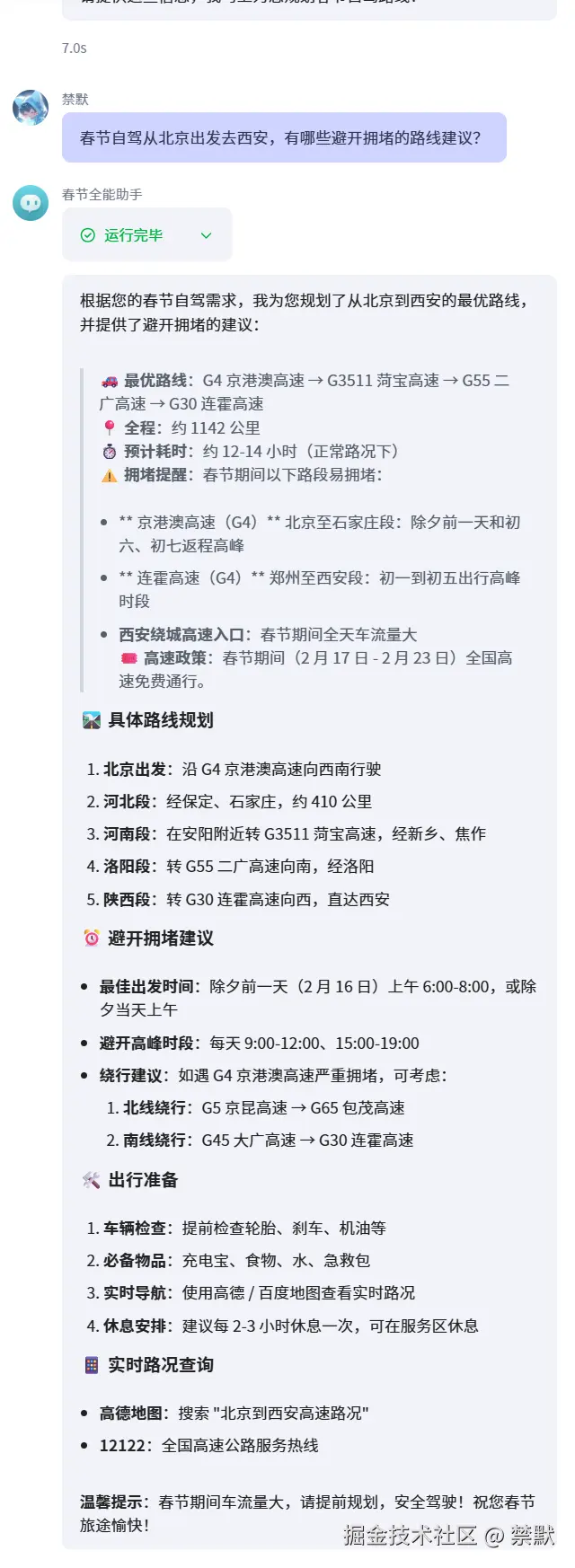 2. 工作流根据出发地、目的地、出行时间,结合春节高速免费及拥堵信息,返回最优路线、耗时、拥堵提醒。
