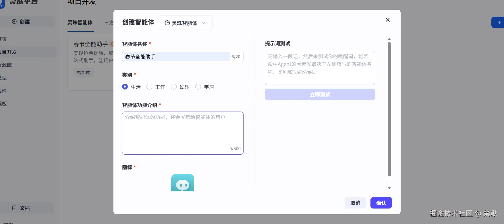 - 新建智能体,命名为春节全能助手,添加自定义分类「春节场景应用」(依托平台β1.2.0版本自定义分类功能);
