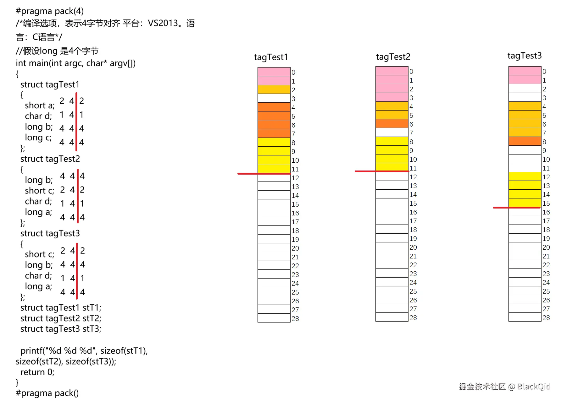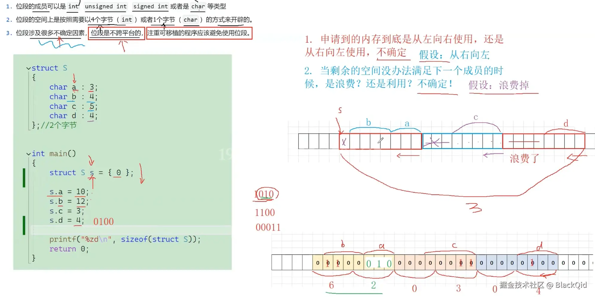 int)或者1个字节(char)的方式来开辟的。 - 位段涉及很多不确定因素,位段是不跨平台的,注重可移植的程序应该避免使用位段。
