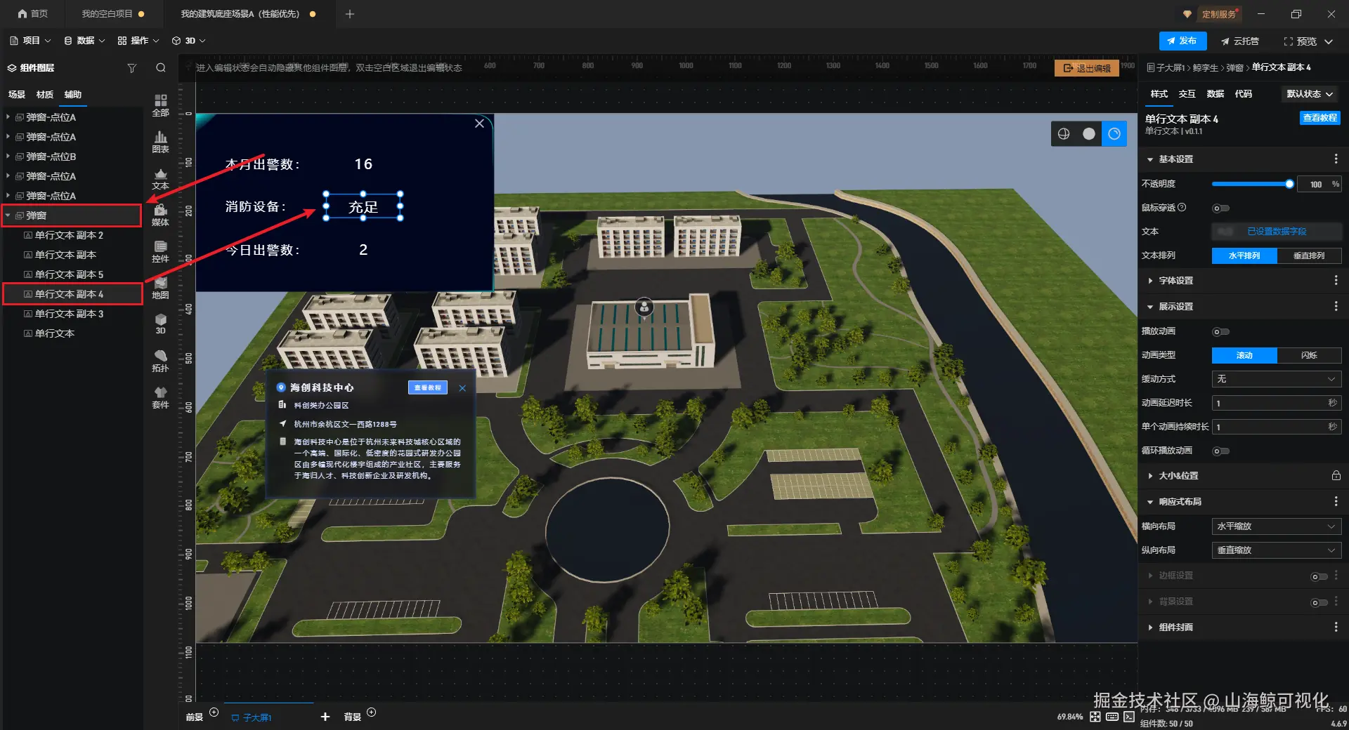 添加标记点后,通常我们还需要为其添加 “弹窗” 组件,来展示标记点对应的数据信息。此次改版我们新增了一批自带弹窗的标记点组件,同时对相关功能进行了更新。