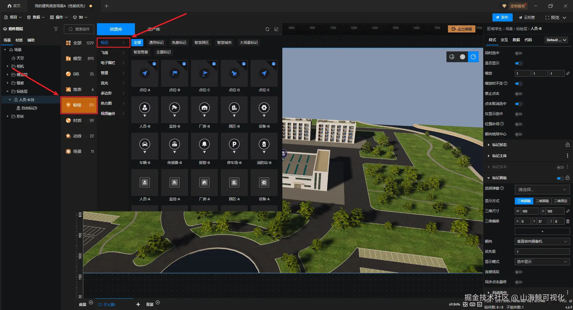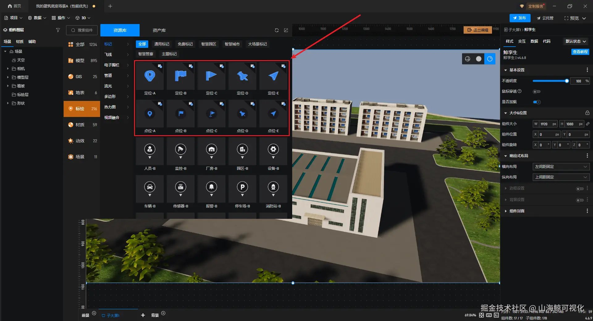 首先,在左侧模型库中选择 “标绘-标记” ,选择一个标记点添加。
