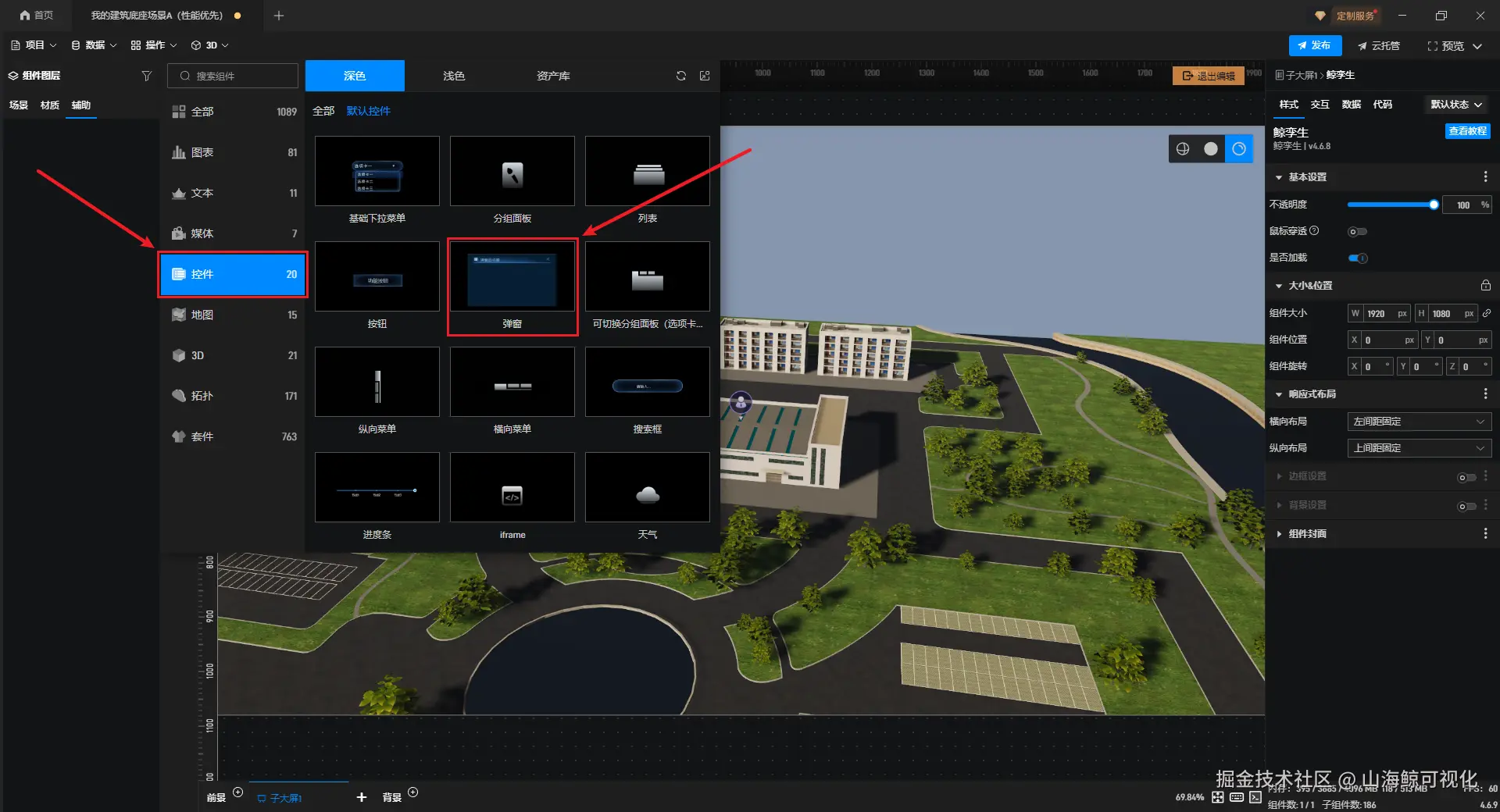 在左侧组件库中,选择 “控件-弹窗” 添加。