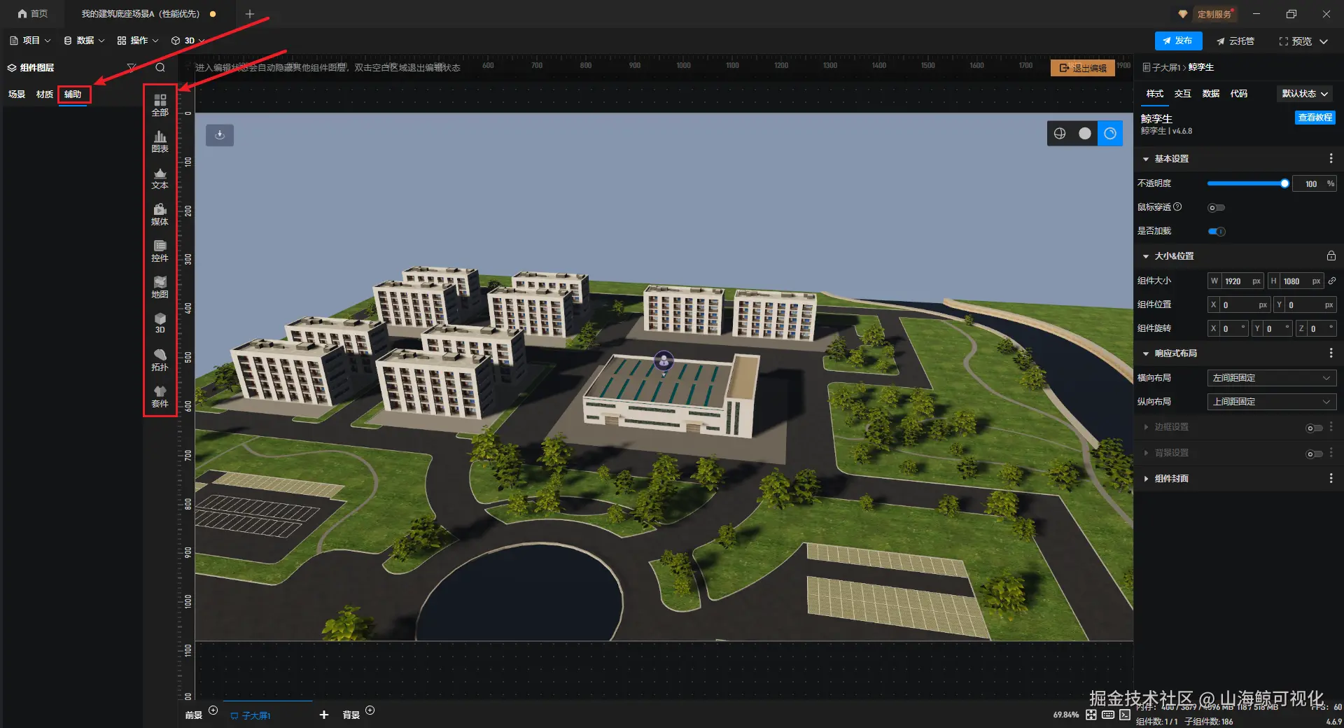 在左侧图层列表上方,将 “场景” 切换为 “辅助” ,可以看到此时左侧模型库变为了组件库。