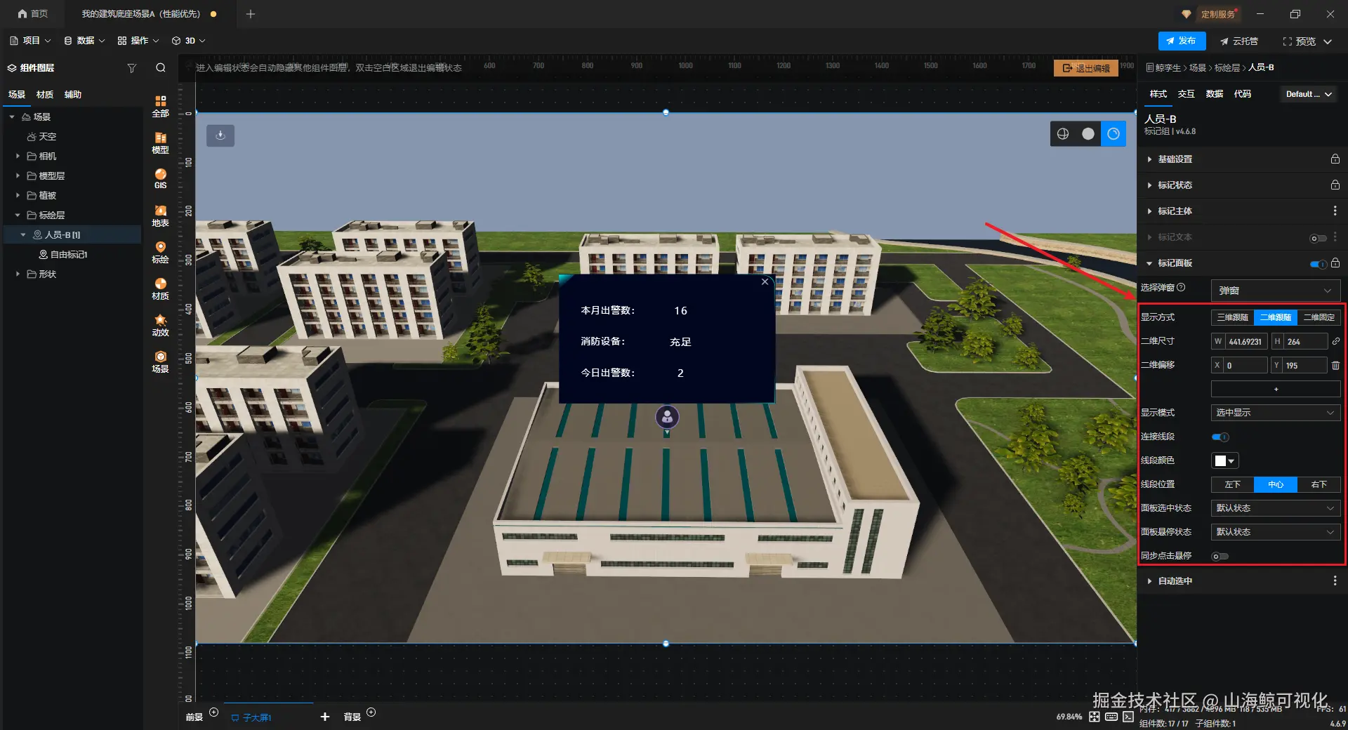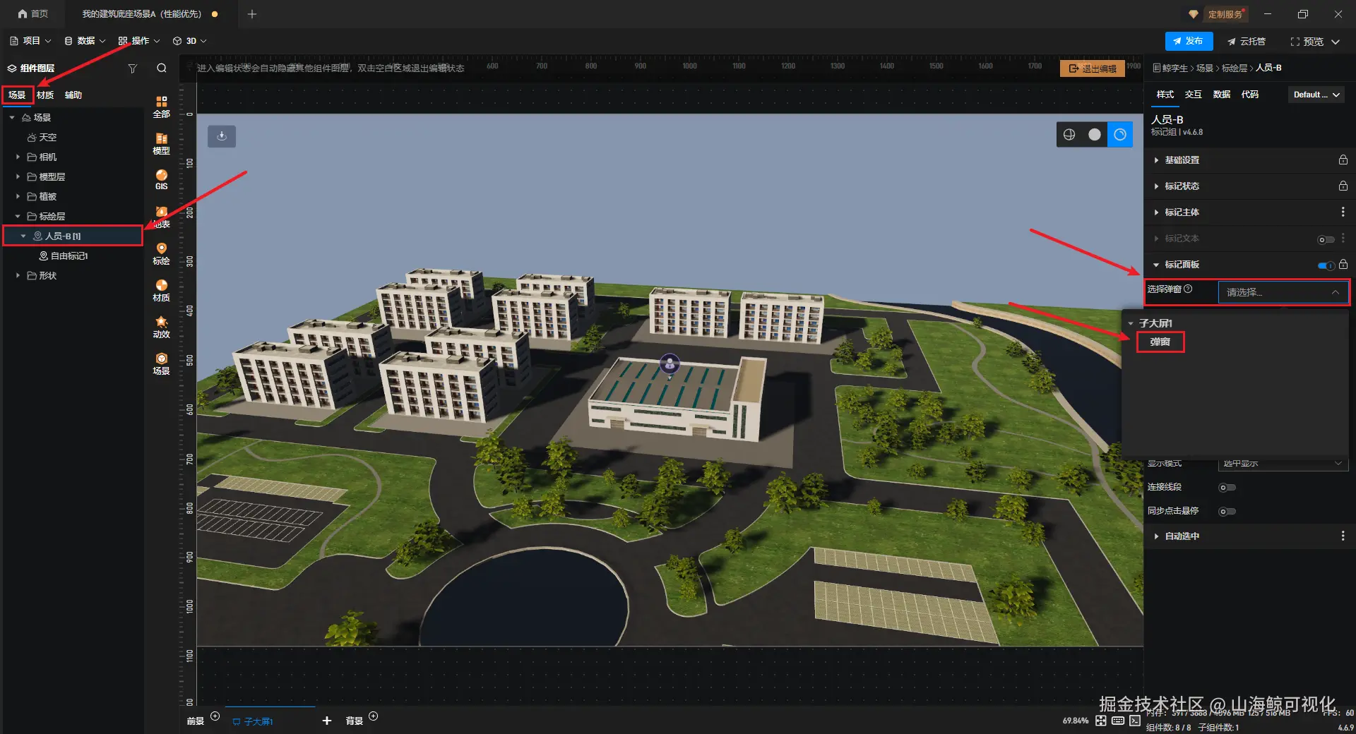 回到 “场景” 设置,在左侧图层列表中选中标记组图层,然后在 “选择弹窗” 中添加刚才设置的弹窗。