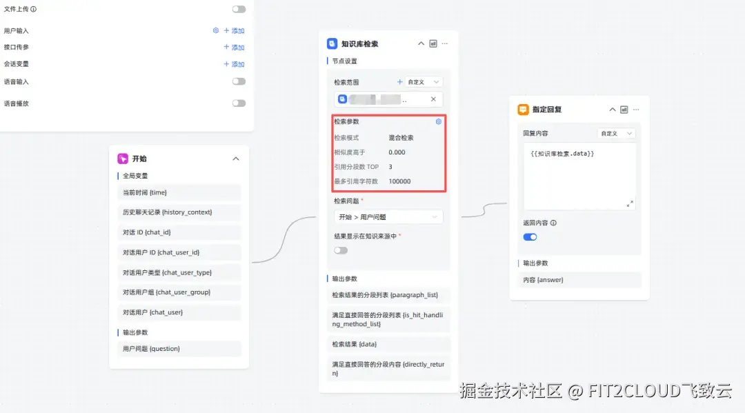 配置要点:不添加AI回答节点,专注于设置相似度阈值、TopK数量或者加入重排序(Rerank)策略。