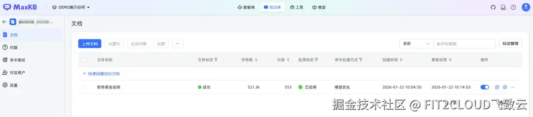 首先,在MaxKB中准备并上传原始文档(例如企业年报、人员手册等),完成高精度的向量化切片。