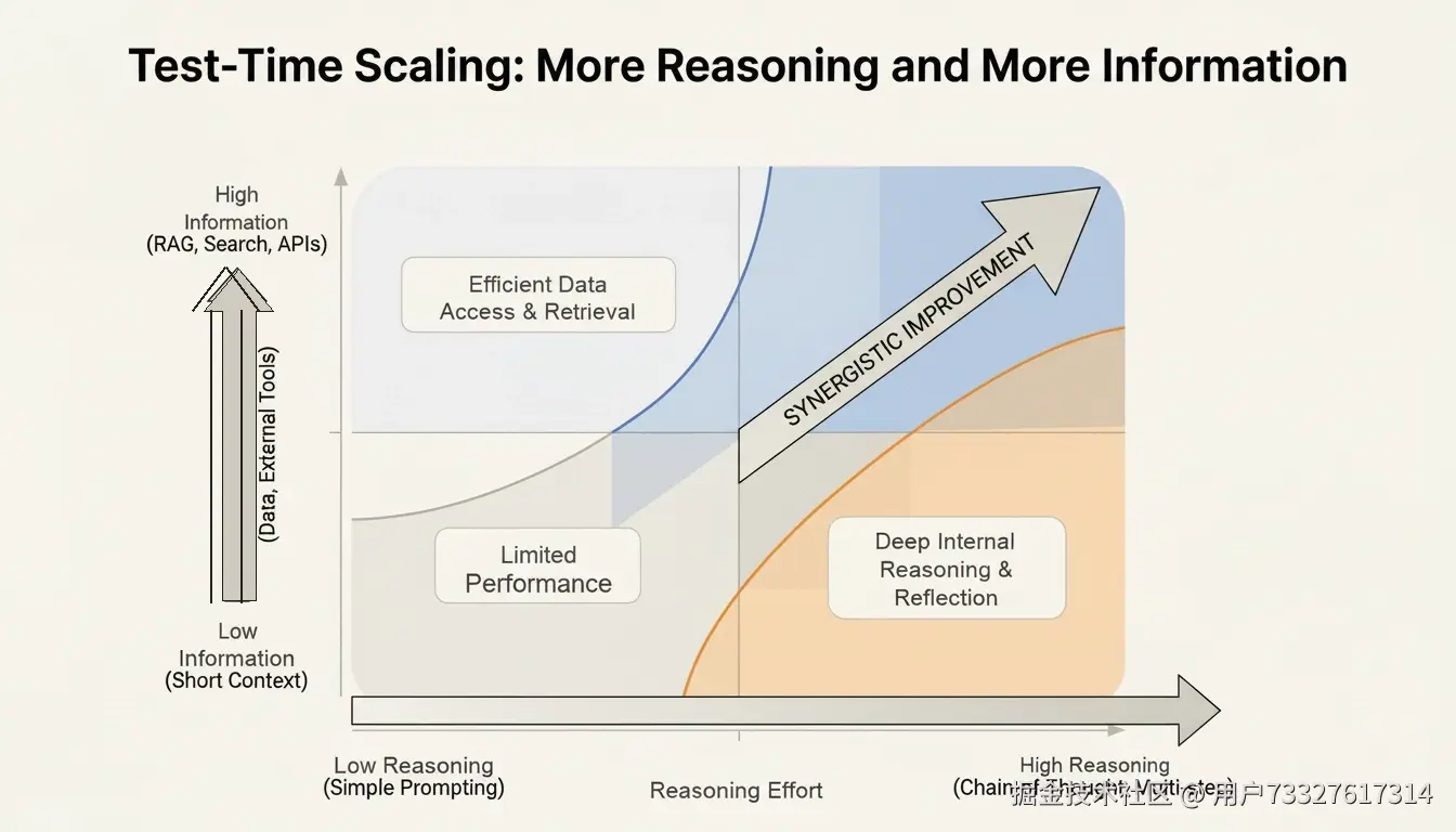 这个循环之所以有效,依赖于**测试时缩放定律(Test-Time Scaling Law)**的两个维度: