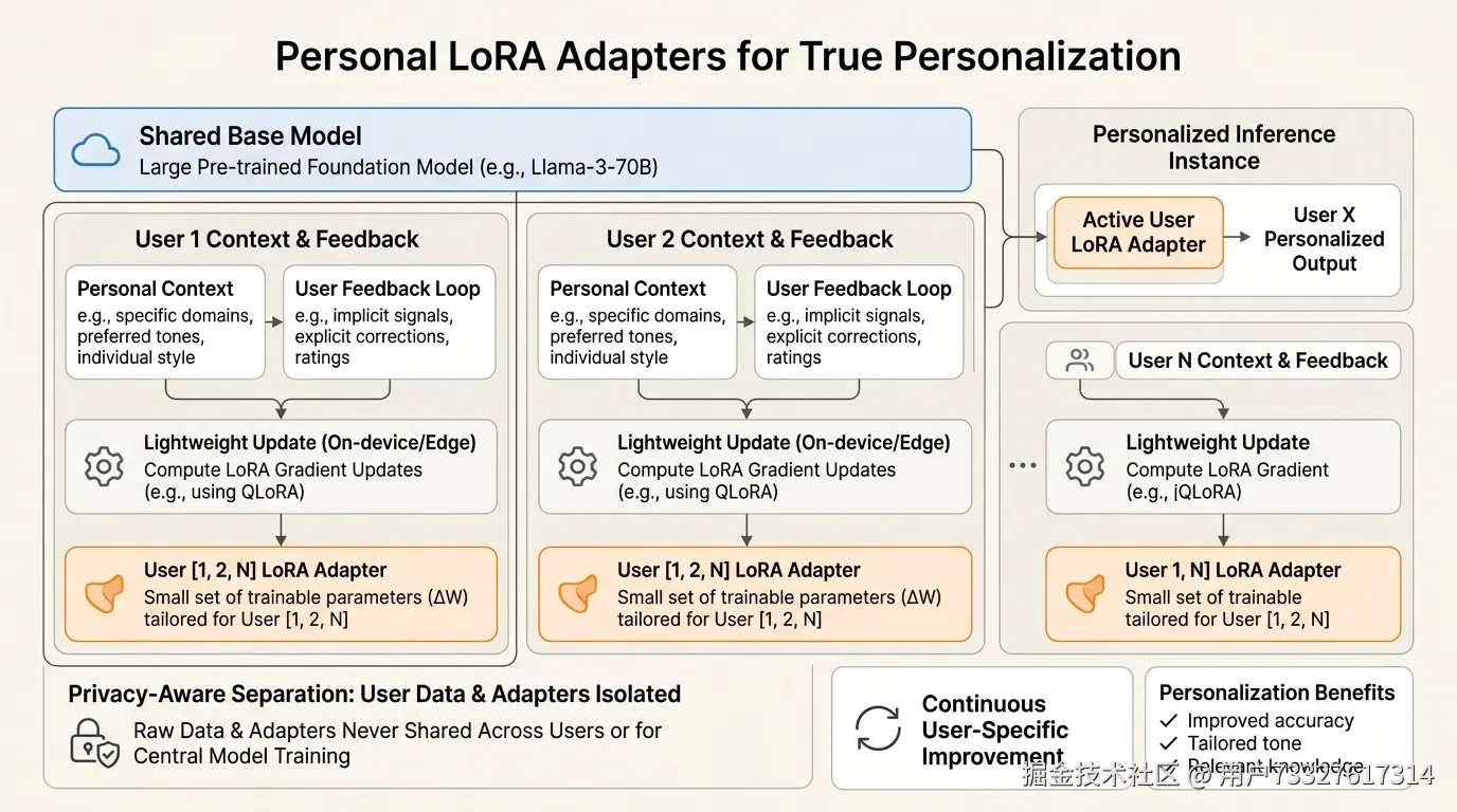 配合LoRA等参数高效微调技术,每个用户都可以维护一个个人LoRA适配器(100MB–1GB) ,持续更新、与用户共同进化。