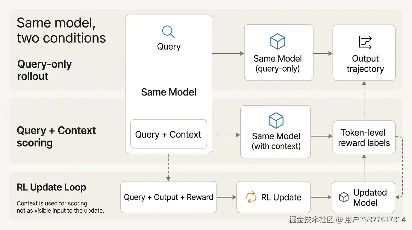 关键区别:上下文只用来打分,不作为训练输入。 这是一种on-policy的蒸馏方式,与传统的off-policy上下文蒸馏(先用上下文生成目标,再用SFT学习)有本质不同。