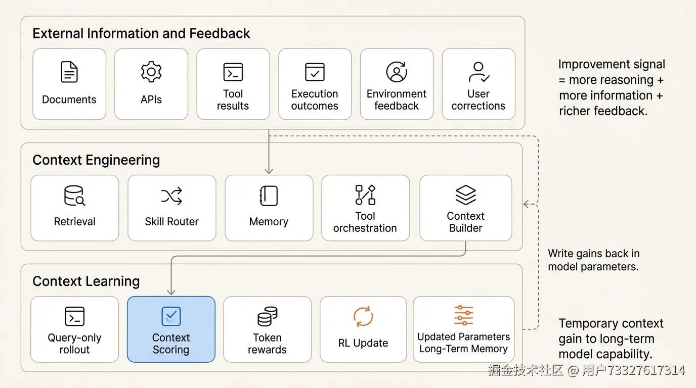 很多现代系统已经能够反思错误、从智能体轨迹中生成可复用的技能。在Context Learning范式下,这些动态生成的技能不仅仅保存为文本文件等待未来检索——它们直接成为训练输入。