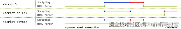 其中蓝色代表js脚本网络加载时间,红色代表js脚本执行时间,绿色代表html解析。