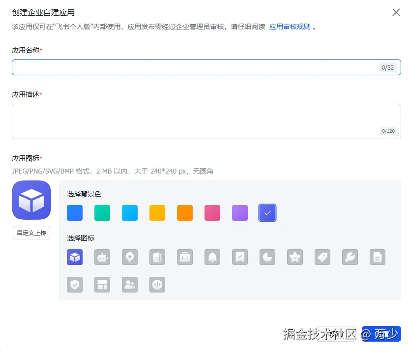 1. 登录飞书,添加企业应用(不需要真有企业)
