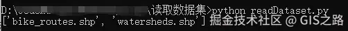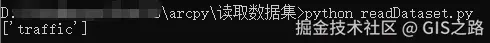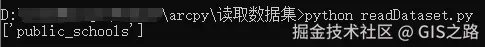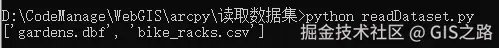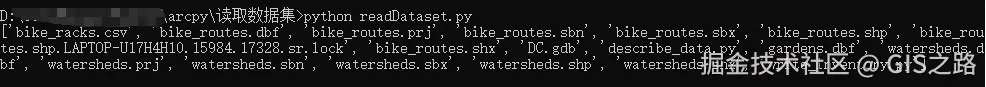 # 导入ArcPy包import arcpyroot_path = "E:\data\shp\PythonDesc"gdb = "DC.gdb"# 定义工作空间arcpy.env.workspace = root_path+""+gdb# 读取数据库文件列表files = arcpy.ListFiles()print(files)