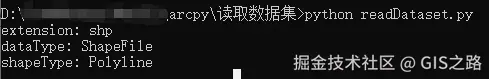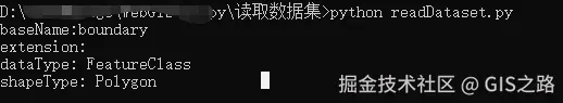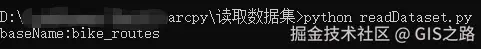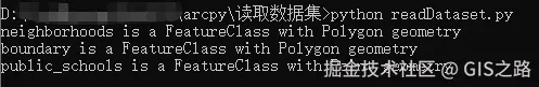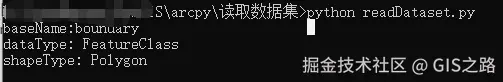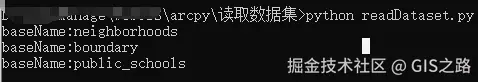 # 导入ArcPy包import arcpyroot_path = "E:\data\shp\PythonDesc"gdb = "DC.gdb"# 定义工作空间arcpy.env.workspace = root_path+""+gdbfiles = arcpy.ListFeatureClasses()for file in files: desc = arcpy.da.Describe(file) print(f"baseName:{desc['baseName']}")