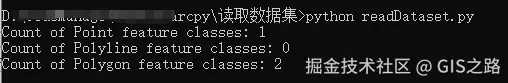 # 导入ArcPy包import arcpyroot_path = "E:\data\shp\PythonDesc"gdb = "DC.gdb"# 定义工作空间arcpy.env.workspace = root_path+""+gdbcount_point = len(arcpy.ListFeatureClasses(feature_type="POINT"))count_line = len(arcpy.ListFeatureClasses(feature_type="POLYLINE"))count_poly = len(arcpy.ListFeatureClasses(feature_type="POLYGON"))print(f"Count of Point feature classes: {count_point}")print(f"Count of Polyline feature classes: {count_line}")print(f"Count of Polygon feature classes: {count_poly}")