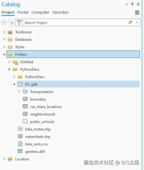 # 导入ArcPy包import arcpyroot_path = "E:\data\shp\PythonDesc"gdb = "DC.gdb"# 定义工作空间arcpy.env.workspace = root_path+""+gdb+"\Transportation"