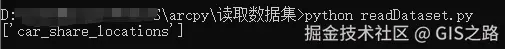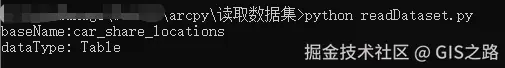 显示结果如下,其dataType类型为Tabel。car_share_locations 项目是一个地理数据库表。 其中没有扩展名,也没有 shapeType 条目,因此不会打印这些行。