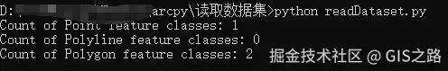 desc = arcpy.da.Describe(file)# 统计要素类数量if desc["shapeType"] == "Point": count_point += 1if desc["shapeType"] == "Polyline": count_line += 1if desc["shapeType"] == "Polygon": count_poly += 1