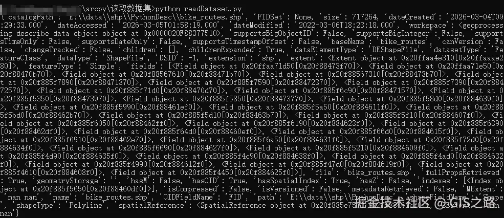 # 导入ArcPy包import arcpyroot_path = "E:\data\shp\PythonDesc"gdb = "DC.gdb"# 定义工作空间arcpy.env.workspace = root_pathdesc = arcpy.da.Describe("bike_routes.shp")# desc = arcpy.da.Describe("bike_racks.csv")# print(f"{desc}")# print(f"baseName:{desc['baseName']}")# print(f'extension: {desc["extension"]}')# print(f'dataType: {desc["dataType"]}')# # if 'shapeType' in desc:# print(f'shapeType: {desc["shapeType"]}')for k,v in desc.items(): print(f"{k}:{v}")