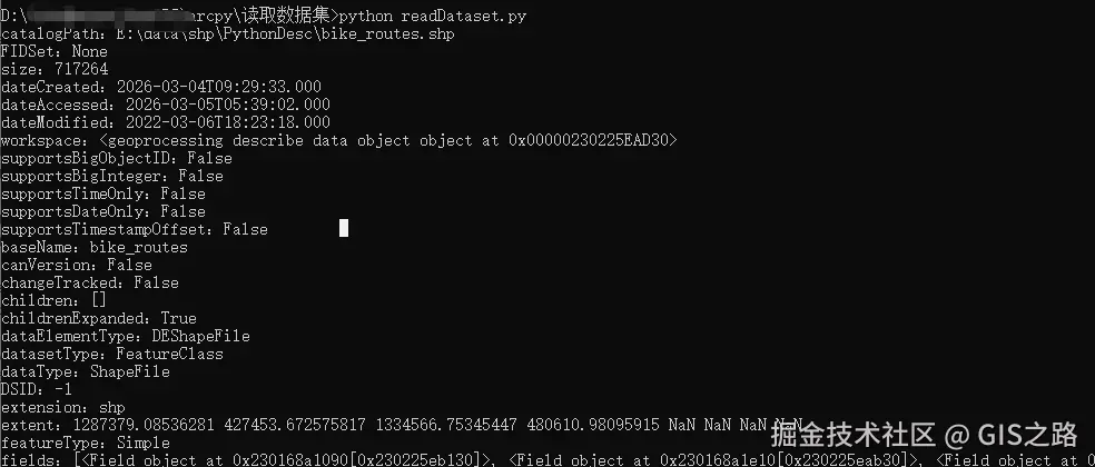 # 导入ArcPy包import arcpyroot_path = "E:\data\shp\PythonDesc"gdb = "DC.gdb"# 定义工作空间arcpy.env.workspace = root_pathdesc = arcpy.da.Describe("bike_routes.shp")print(desc)