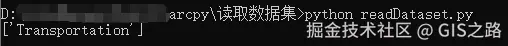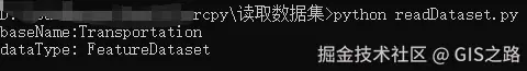 显示结果如下,其dataType类型为FeatureDataset。Transportation是地理数据库中的要素数据集。要素数据集包含共享公共坐标系的数据元素。 要素数据集可用作工作空间。