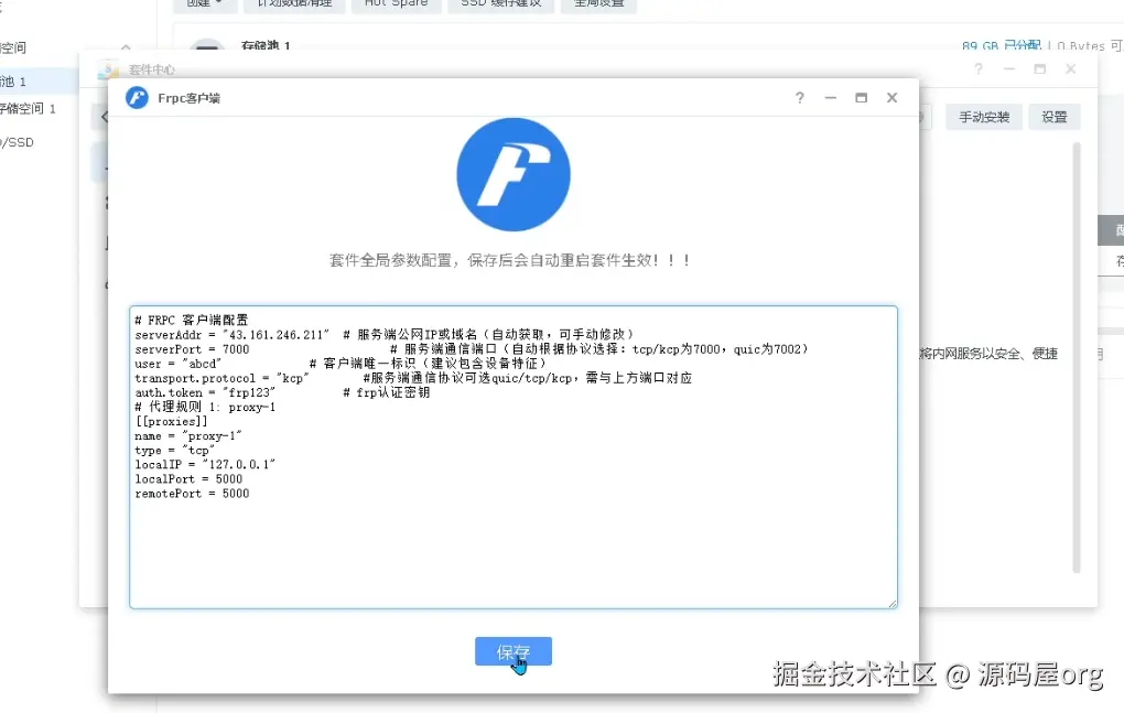 进入本地群晖Nas,套件中心,找到frpc客户端并安装后,打开软件并编辑配置文件,将上一步生成的客户端配置信息粘贴上并提交保存