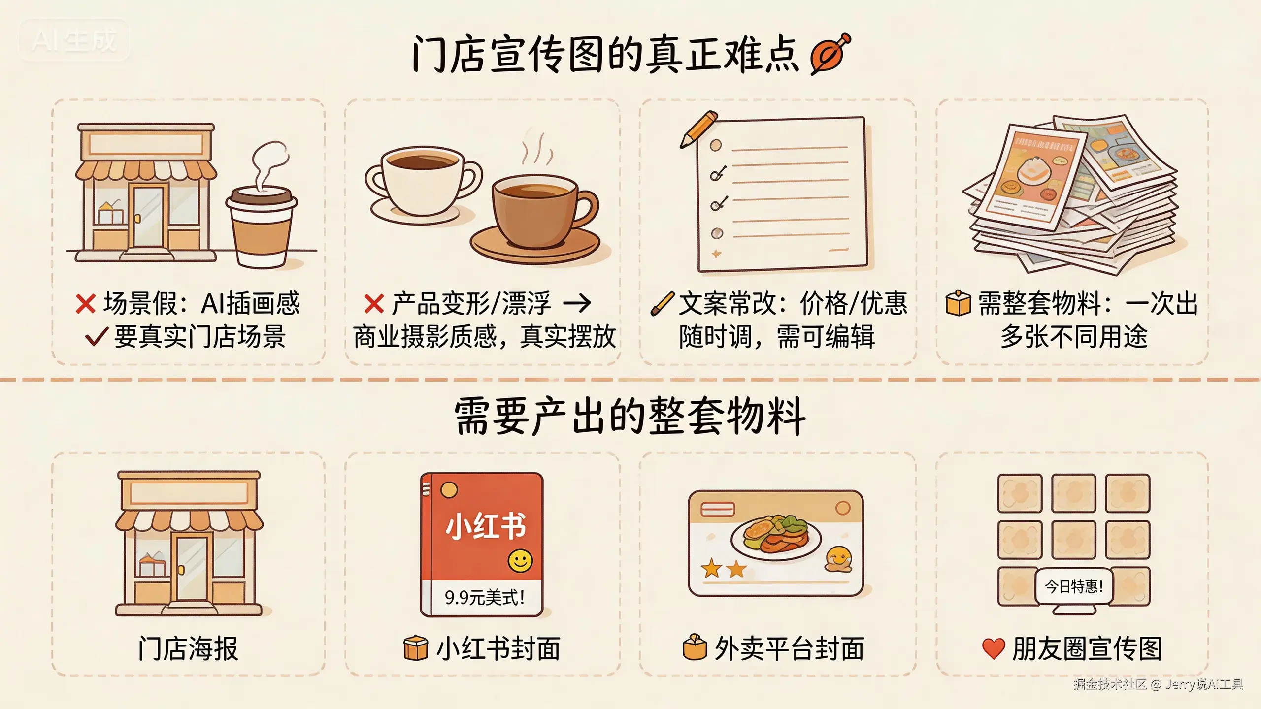 不是说设计不重要,而是现在 AI 已经能把 80%的门店宣传图直接做出来。