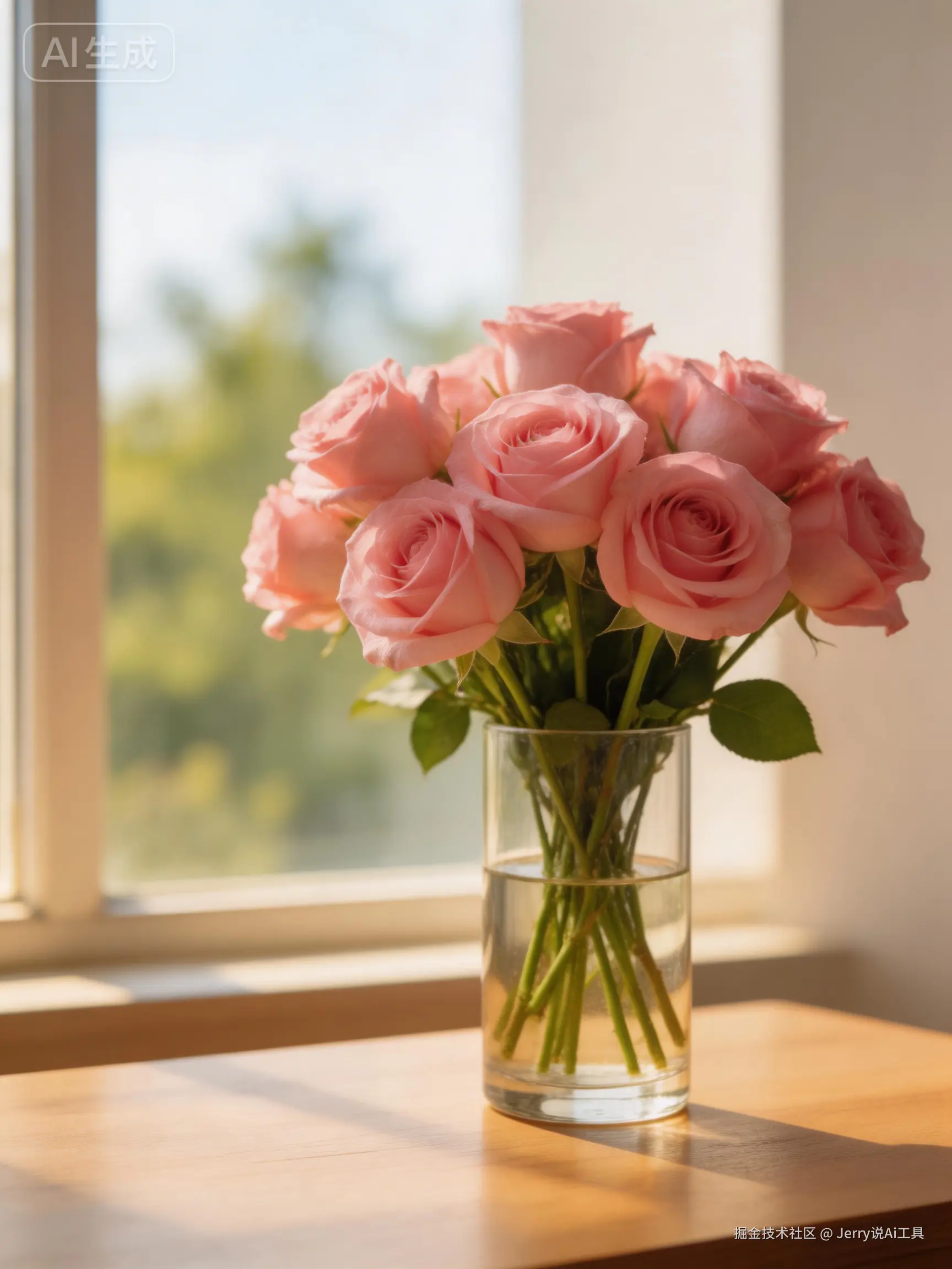 花店节日宣传海报,粉色玫瑰花束,玻璃花瓶摆放在桌面,自然阳光窗边场景,柔和背景虚化,商业摄影风格,门店活动宣传图构图,预留出添加文字的区域