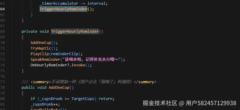 触发提醒时做了几件事:自动加一杯、震动、播放心跳音、语音播报占位、抛事件让UI知道。这里把音效和语音都设计成可选,reminderClip和goalReachedClip可以在Inspector里拖拽赋值。