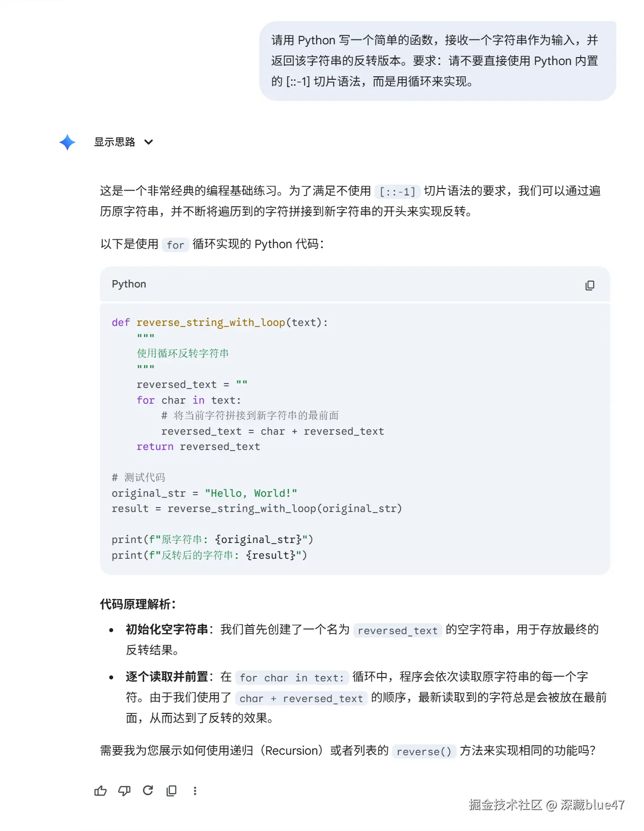 测试提示词:请用 Python 写一个简单的函数,接收一个字符串作为输入,并返回该字符串的反转版本。要求:请不要直接使用 Python 内置的 [::-1] 切片语法,而是用循环来实现。