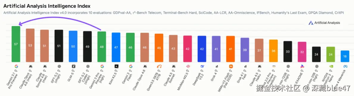 在人工智能分析智力指数(v4.0)排行榜中,最新发布的 Gemini 3.1 Pro Preview 表现极为惊艳,以 57分 的最高分稳居榜首。图中特意画了一根显眼的紫色弧形箭头,直观展示了从之前 48 分的旧版本(Gemini 3 Pro)到现在的 Gemini 3.1 Pro 所带来的突飞猛进的能力跃升。