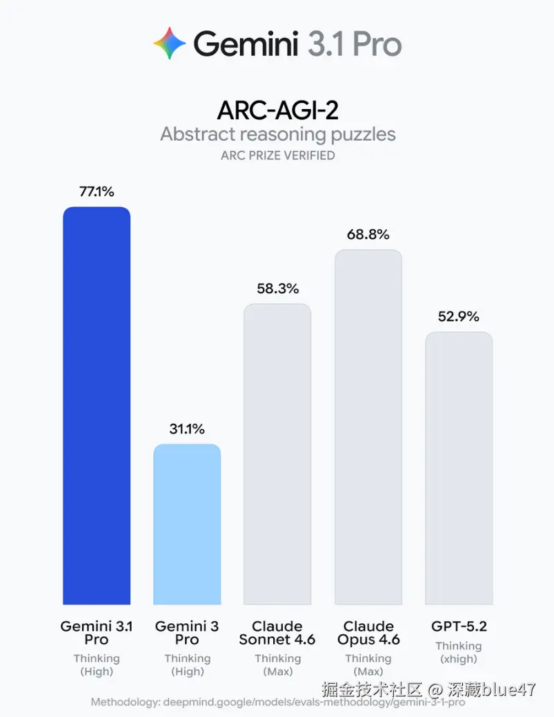 在极具挑战的 ARC-AGI-2 测试中,Gemini 3.1 Pro 更是以 77.1% 的逆天成绩一骑绝尘,把刚刚登顶的 Opus 4.6(68.8%)逼到了墙角。