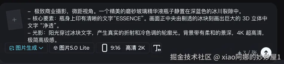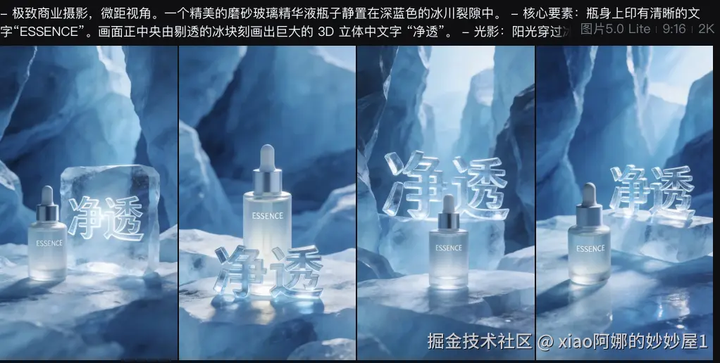 这是即梦Seedream 5.0生图模型的杀手锏。它不仅能写中文,而且它懂“设计美学”。你让它在瓶身上写“MOISTURE”,在背景写“水润新生”,它绝不拼错。更牛的是,它能让文字变成冰块、变成丝绸、变成流动的液体。文字不再是浮在表面的图层,而是画面中真实存在的物理实体。