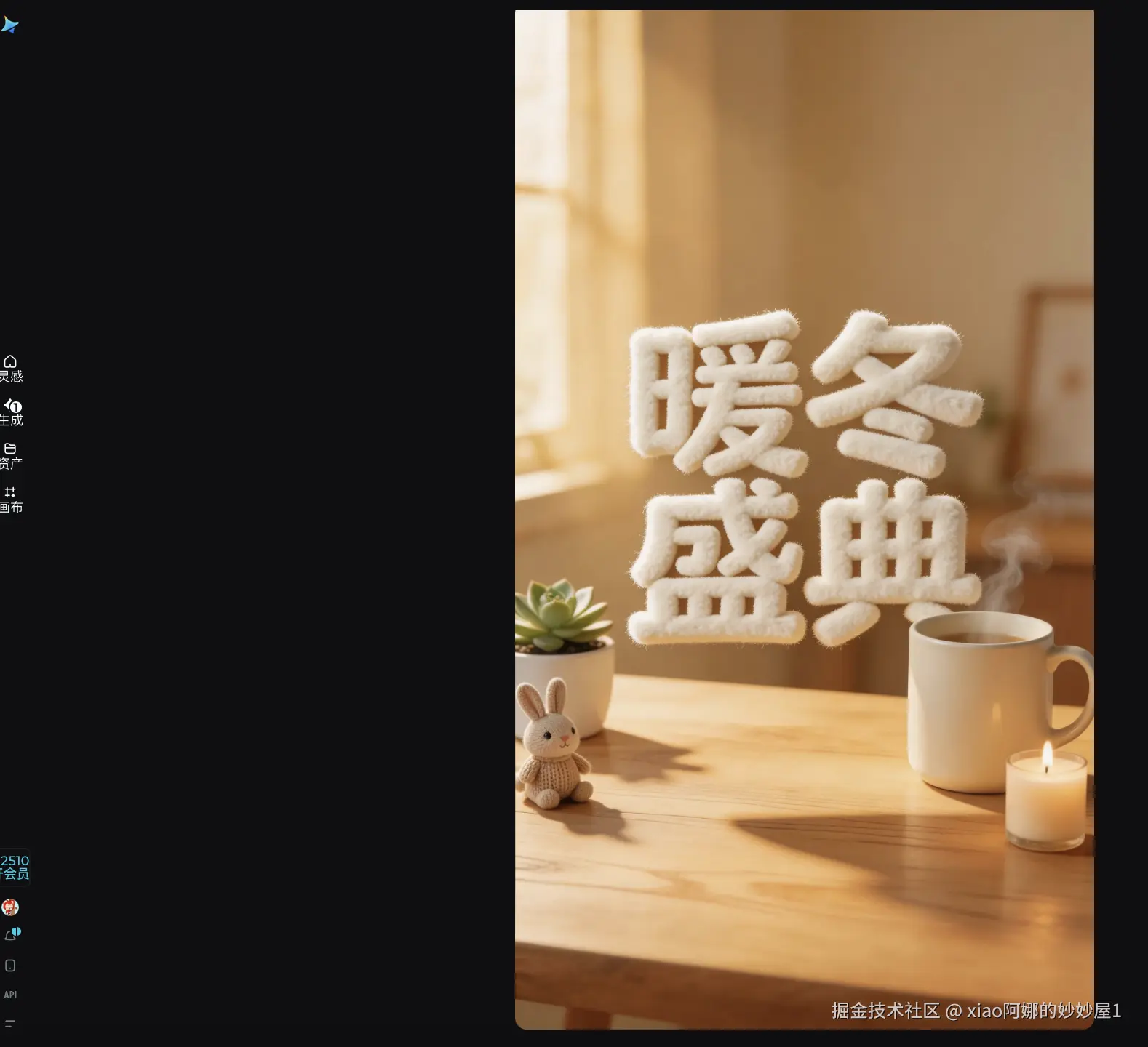 - 痛点:小红书或淘宝直播间需要一张“暖冬节”的海报。要求文字要有毛茸茸的触感,能让人感受到温暖,单纯的字体贴图太生硬。