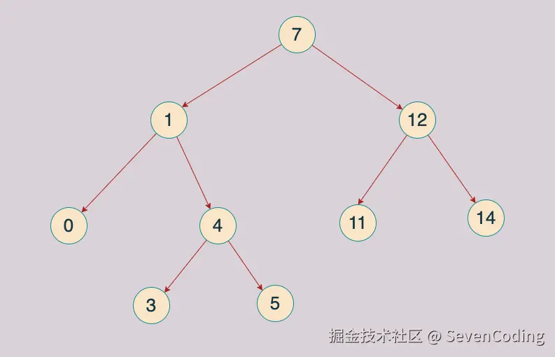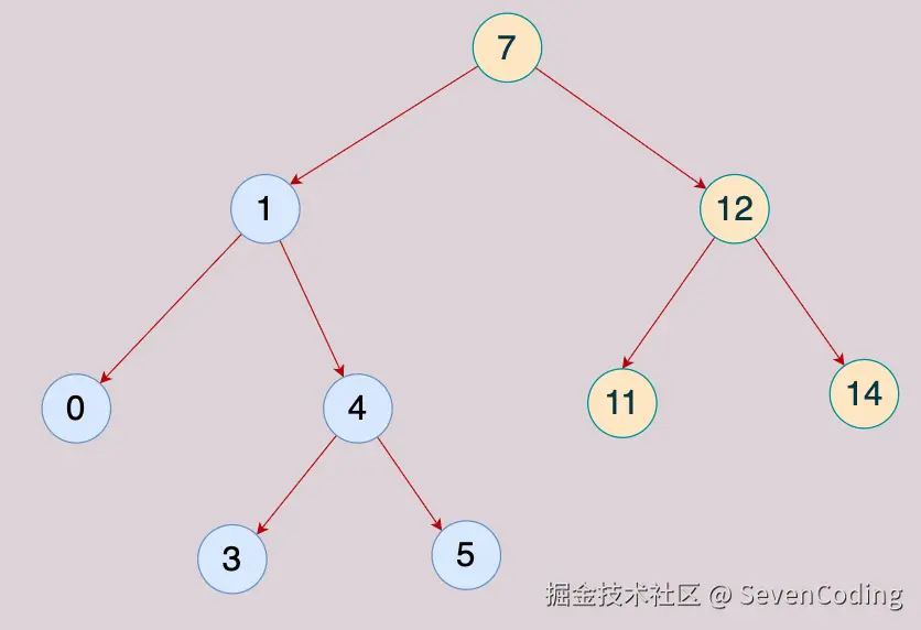 如果给定以下搜索⼆叉树: {7,1,12,0,4,11,14,#,#,3,5} ,如下图: