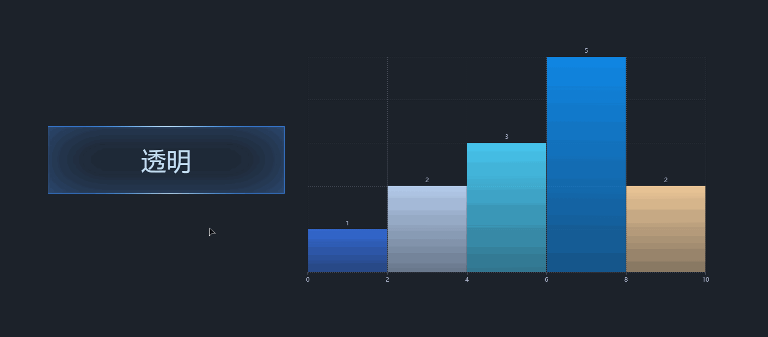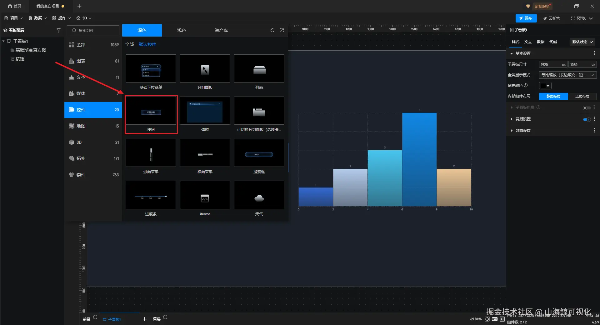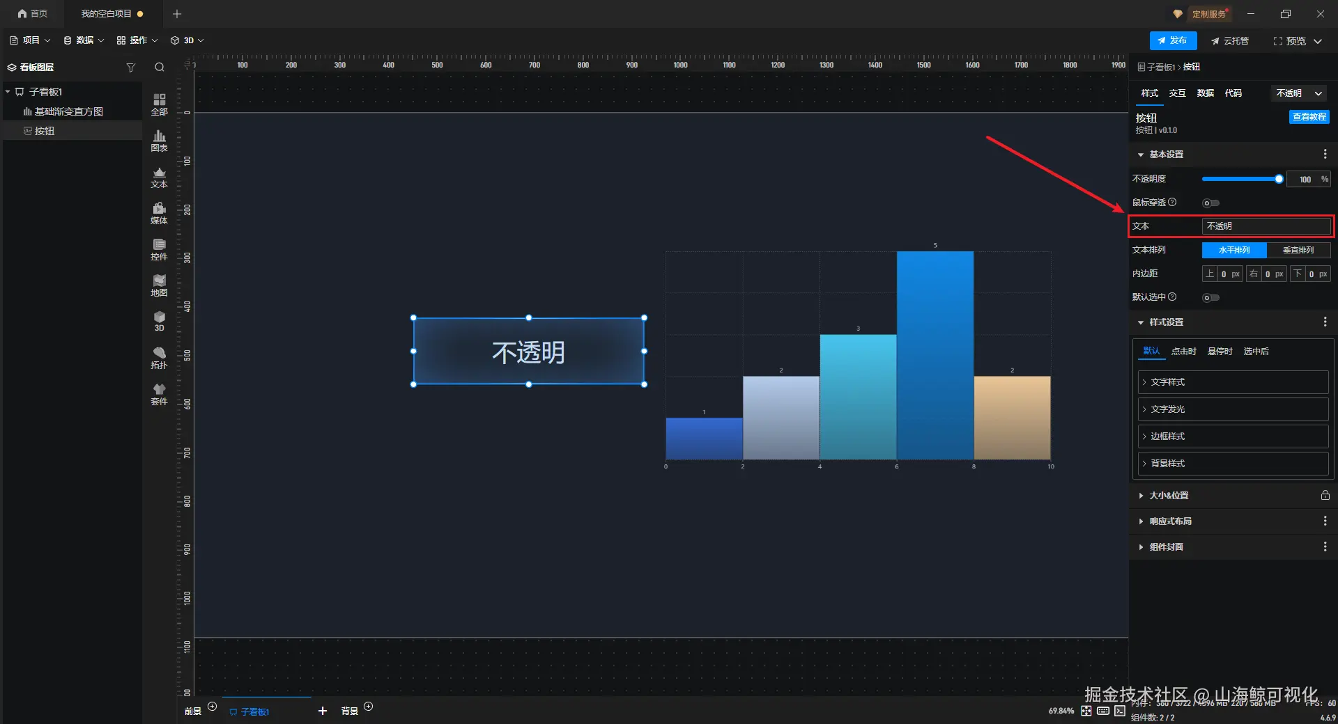 首先,添加一个 “按钮” 组件和需要调整透明度的组件,这里以 “基础渐变直方图” 组件为例进行演示。