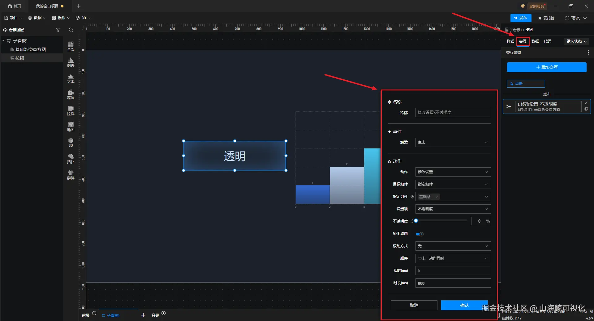 接着切换到 “交互” 设置,为其设置将组件变为透明的交互。