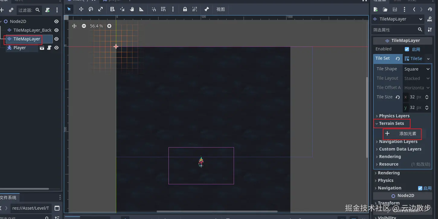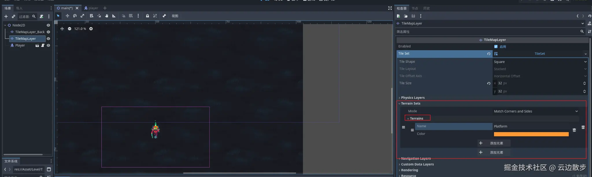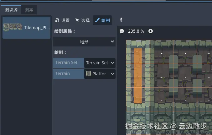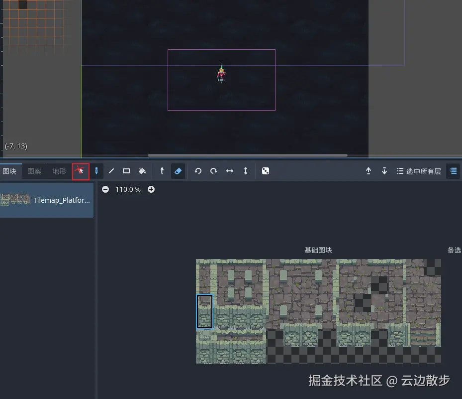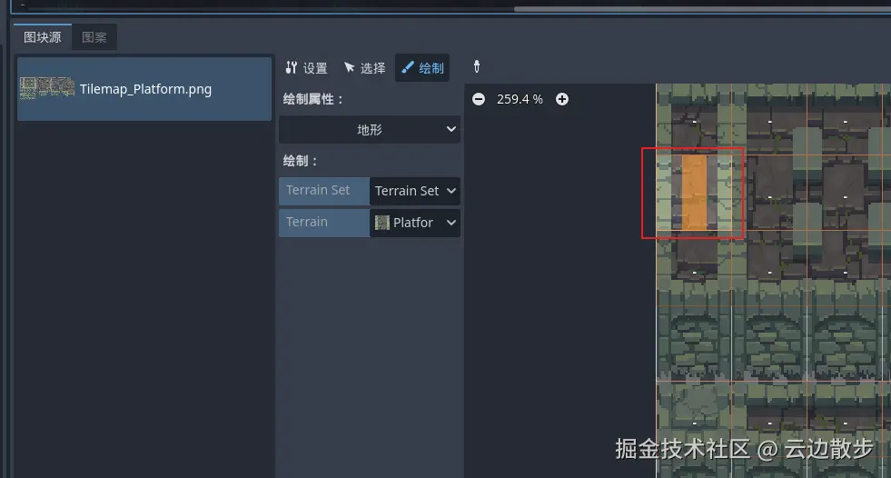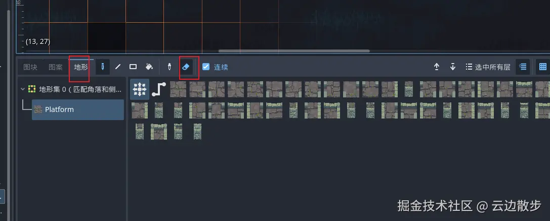 - 然后我们清除一下只绘画的瓦片,这里需要注意的是我们需要选中地形的平台地形然后再去点击橡皮擦进行擦除