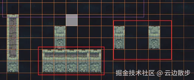 - 然后我们按照垂直方向进行绘画,这里暂时只支持垂直,左右的我们还没设置,然后你可以看到当我们画的时候自动封好边的了。就是可能前面大家跟着做的有点云里雾里的,我也是,然后直到在这里实操的时候我就明白了,这个就是相当于一个更大的组合,这个组合你还可以进行设置对应规则怎么画。简单来说就是,我画一个从上到下的,然后它编辑器自动使用这3种瓦片可以进行拼接的模式进行自动拼贴。