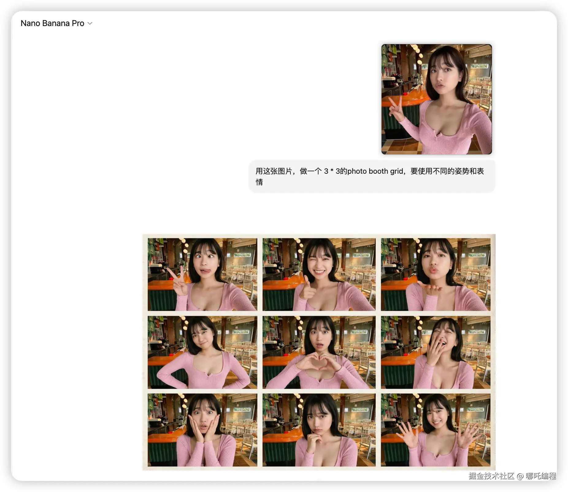 提示词:用这张图片,做一个 3 * 3的photo booth grid,要使用不同的姿势和表情