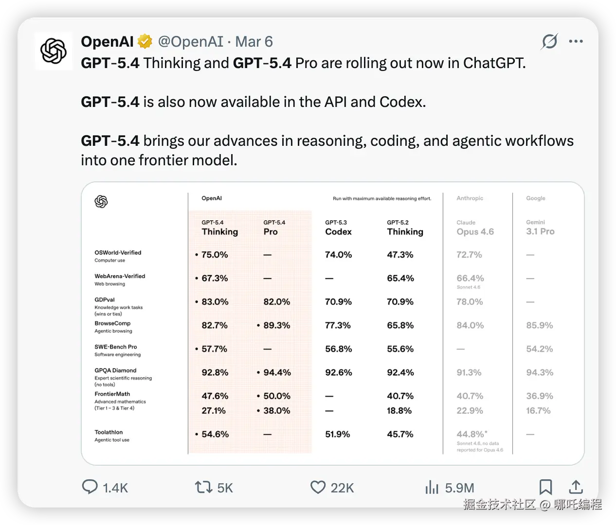 GPT-5.4 = GPT 5.2全面升级 + GPT-5.3-Codex级别的编程能力 + 百万Token上下文窗口 + 工具搜索机制。